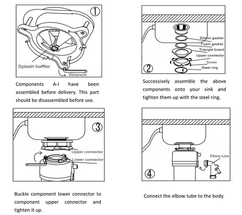 Package includes:1 × Garbage disposer, 2 x Pipe, 1 x Elbow Tube, 1 x Air Pipe, 2 x Lid, 1 × Instruction