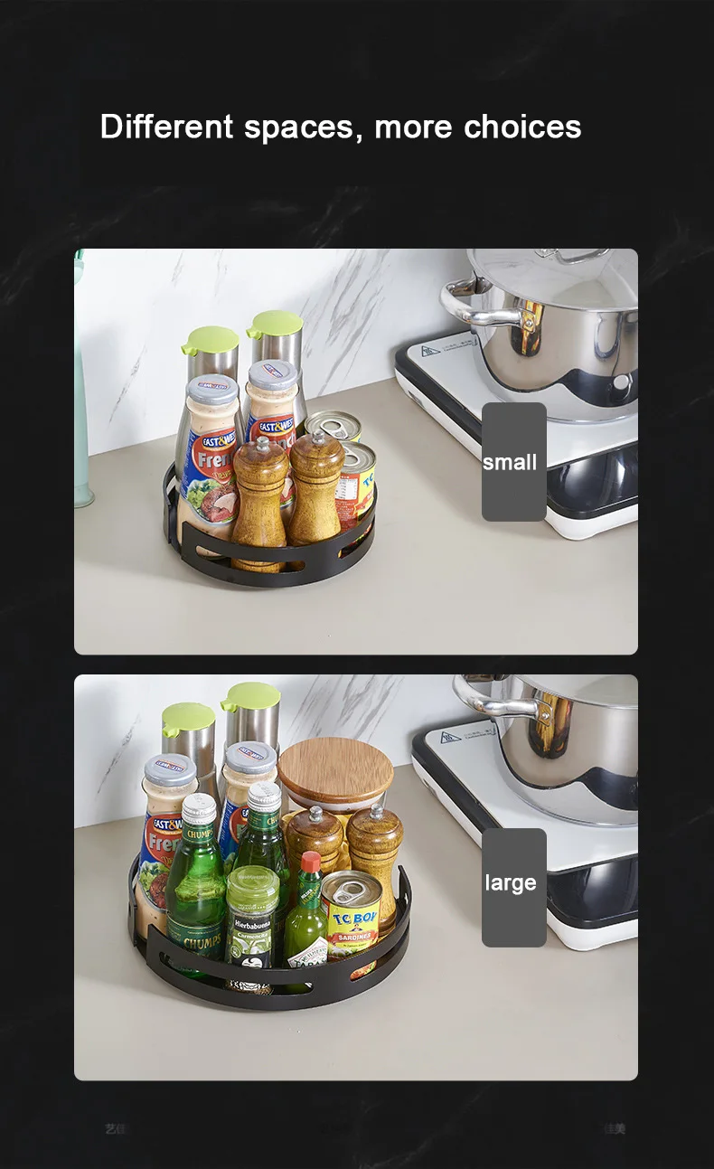 Product name:Kitchen wall hanging rotatable seasoning bottle rackProduct model:YJMHY-2019Product material:Space aluminumSurface treatment:Sandblasting + oxidationInstallation method:Punch/free punchStyle:Modern simplicity