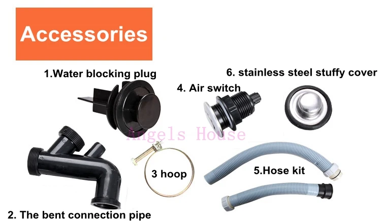 Accessories: 1.Water blocking plug 2. The bent connection pipe 3. hoop 4. Air switch 5.Hose kit 6 stainless steel stuffy cover