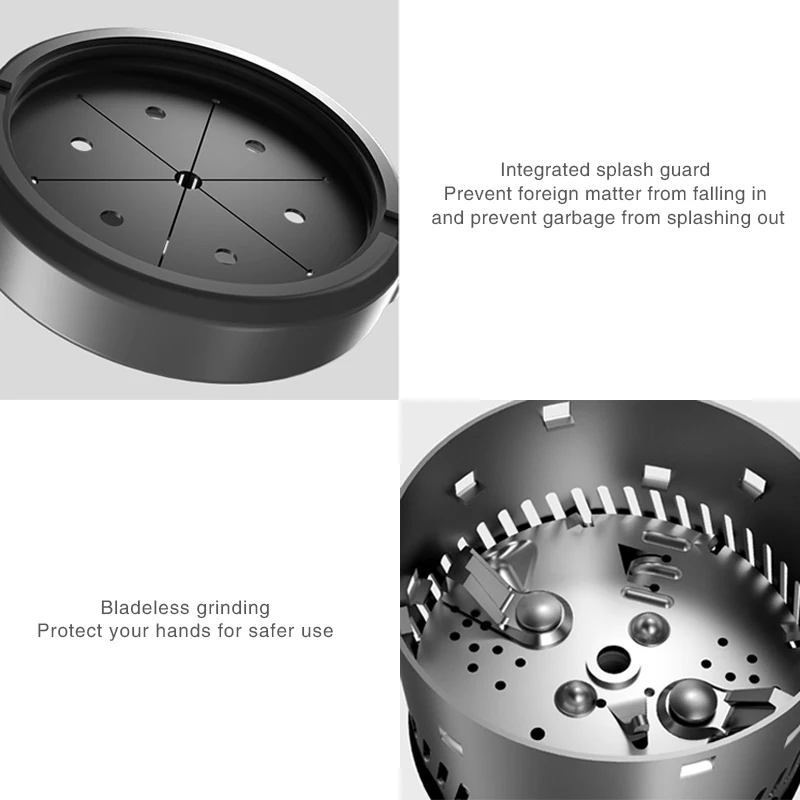Integrated splash guard: prevents foreign objects from falling in, kitchen waste splashing out, neat and safe.Bladeless grinding: Protect your hands and use safely.