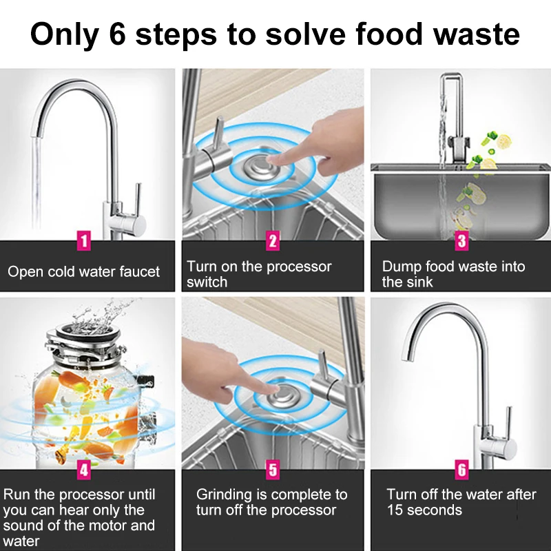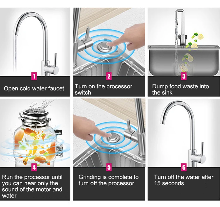 Using Steps:1.Open cold water faucet;2.Turn on the processor switch;3.Dump food waste into the sink; 4.Run the processor until you can hear only the sound of the motor and water;5.Grinding