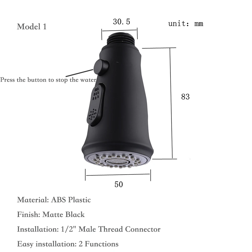 Black Kitchen Pull Out Down Sprayer Faucet Replacement Part Spray Shower Head Name: Sink Faucet Pull Down Spray Material: ABS Plastic Finish: Matte Black/Oil Rubbed Bronze Installation: 1/2" Male Thread Connector Package includes: 1 pc pull out spray Features: Engineering grade plastic (ABS) constructed, ensuring quality and longevity. Industry leading finish, build to resist scratches, corrosion and tarnishing. Universal 1/2¡± IPS connection fits most pull-out hoses. Easy installation. 2 Functions